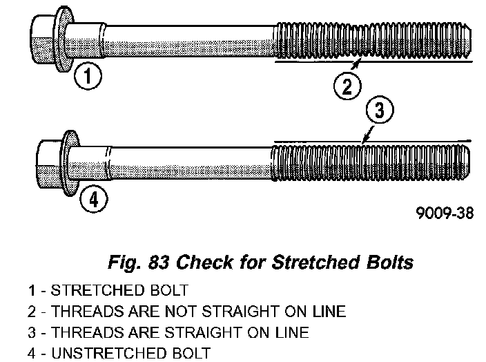 2. Check connecting rod bolts for necking by holding a scale or straight edge against the threads. If all threads do not contact the scale, the bolt must be replaced (Fig. 83).
