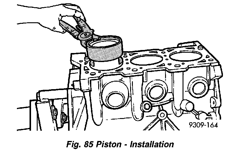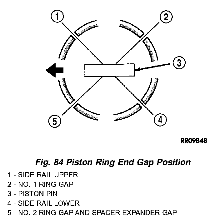 3. Before installing pistons and connecting rod assemblies into the bore, ensure that compression ring gaps are staggered so that neither is in line with oil ring rail gap (Fig. 84).