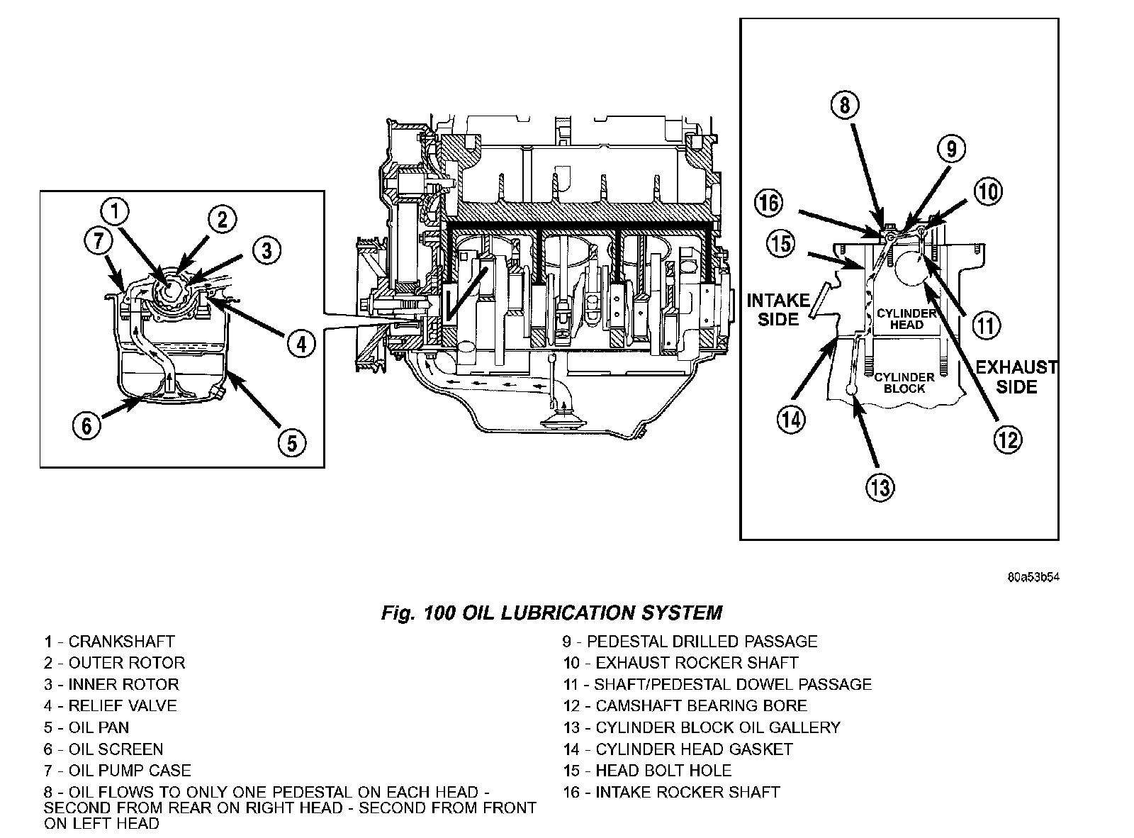 Engine oil stored in the oil pan is drawn in and discharged by a gerotor type oil pump. The oil pump is directly coupled to the crankshaft. Oil pressure is regulated by a relief valve. The oil is fed through an oil filter and to the crankshaft journals from the oil gallery in the cylinder block. This gallery also feeds oil under pressure to the cylinder heads. Oil flows through each cylinder heads oil passage to the rocker shafts. Oil then feeds the camshaft journals, rocker arms, and hydraulic lash adjusters (Fig. 100).