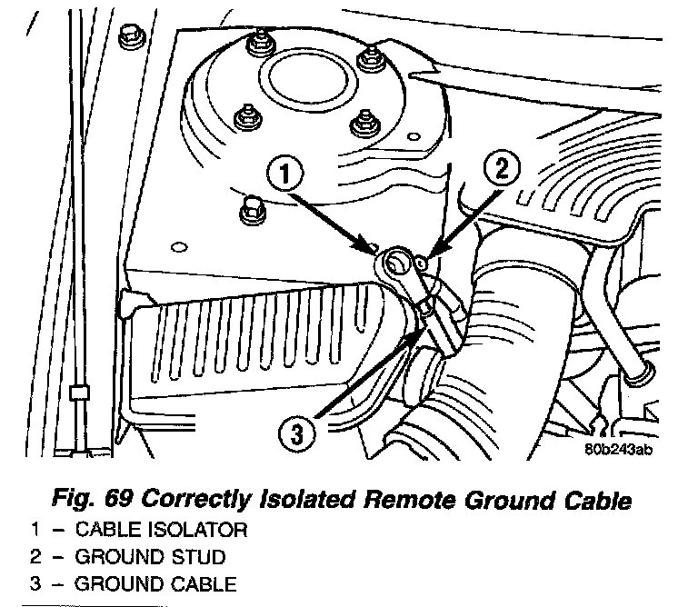 1. Remove remote ground cable from ground stud on shock tower. Then correctly isolate ground cable from vehicle by installing isolator on stud.