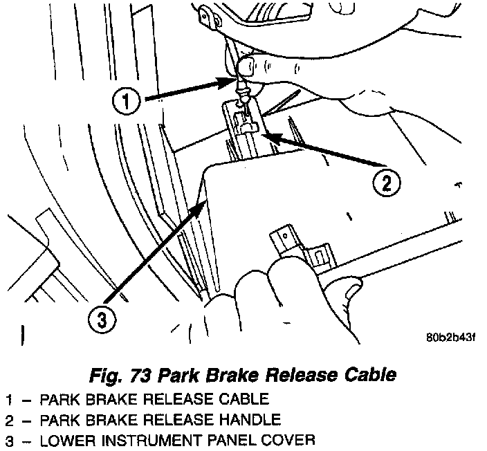 12. Remove the park brake release cable from the park brake release handle in the lower instrument panel cover.