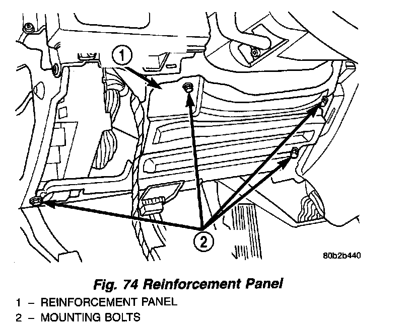 13. Remove the 4 bolts mounting the reinforcement to the instrument panel. Remove the reinforcement from the instrument panel. Remove the diagnostic connector from the reinforcement.