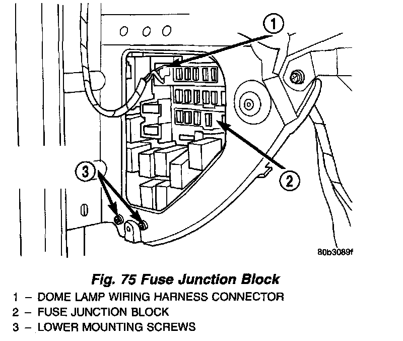 15. Remove the 2 lower mounting screws securing fuse junction block bracket to instrument panel end housing.