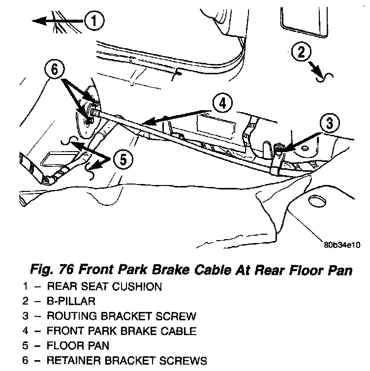 23. Remove the 2 screws securing the front park brake cable retainer bracket to the rear floor pan).
