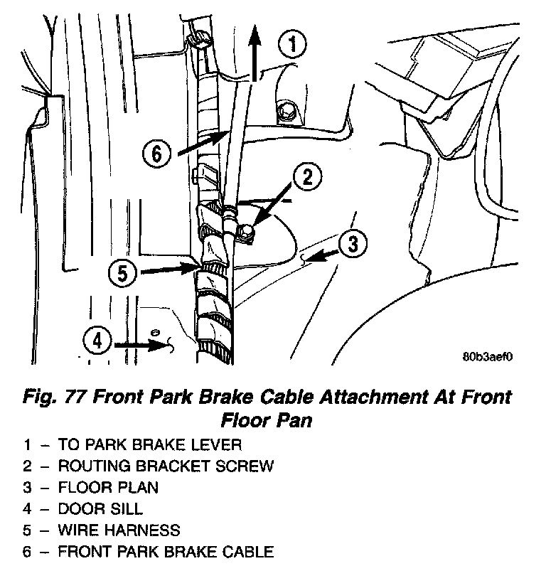 24. Remove 2 routing bracket screws securing front park brake cable to left side of the passenger compartment floor. One screw is at the base of the B-pillar by the seat belt anchor bolt, and the other is below the park brake lever assembly on the floor pan.