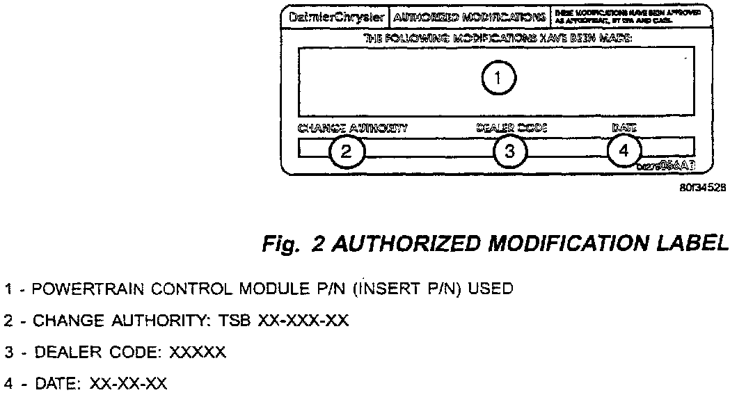 3. Type the necessary information en the "Authorized Modification Label" p/n 04275086AB and attach near the VECI label (Fig. 2).