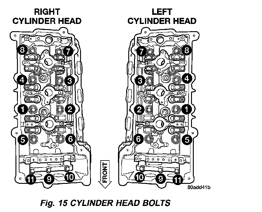 13. Remove cylinder head bolts in reverse sequence of installation (Fig. 15) starting with bolts 11-9, then bolts 8-1.