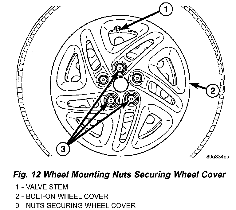 2. Noting the location of the valve stem in relationship to the wheel mounting nuts, remove the three wheel mounting nuts securing the wheel cover to the wheel and hub.