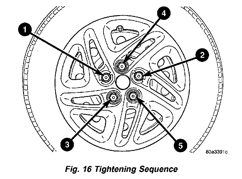 5. Progressively tighten all five wheel mounting nuts in the proper sequence. Tighten wheel nuts to a torque of 135 Nm (100 ft. lbs.).