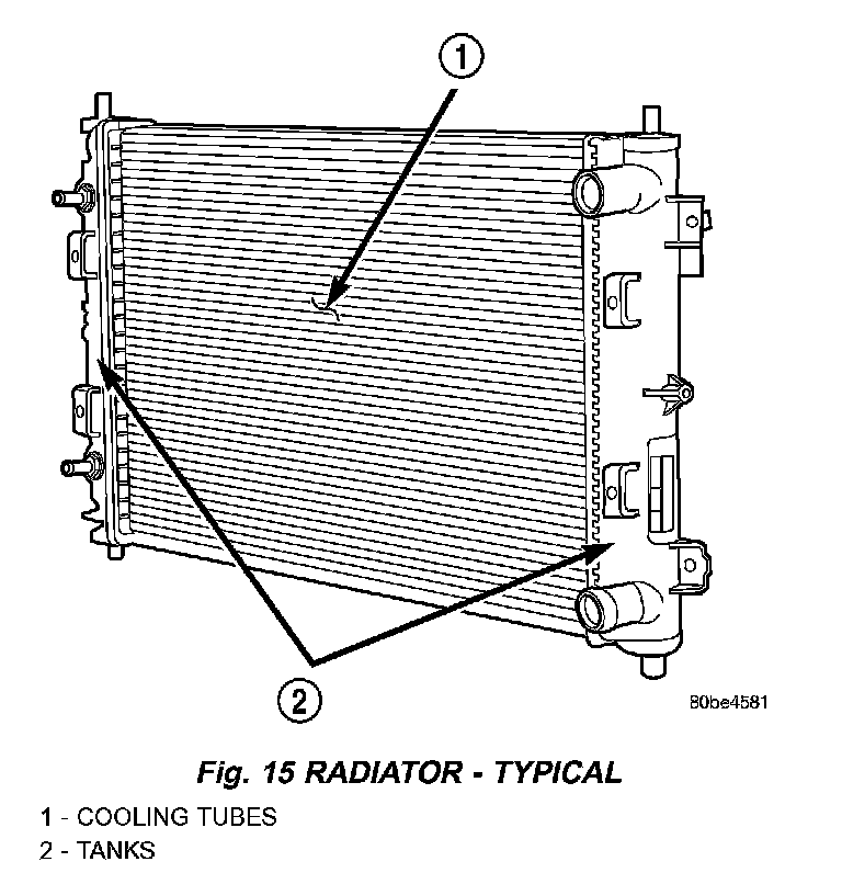 DESCRIPTIONThe radiators are cross-flow types (horizontal tubes) with design features that provide greater strength as well as sufficient heat transfer capabilities to keep the engine satisfactorily cooled. The radiator cooling tubes are made of aluminum and the side tanks are plastic. The radiator is positioned in the front part of the engine compartment to allow air flow across the cooling fins while vehicle is in motion.