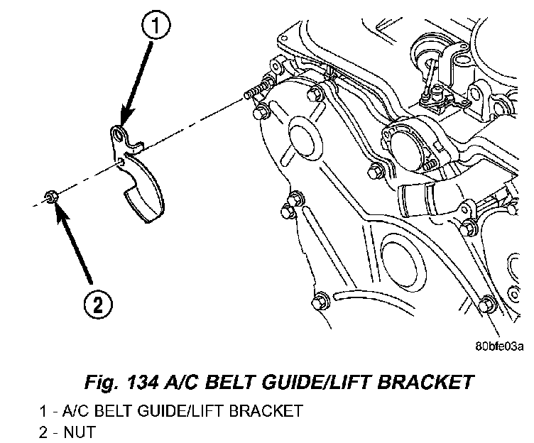 7. Remove the A/C belt guide/lift bracket (Fig. 134).