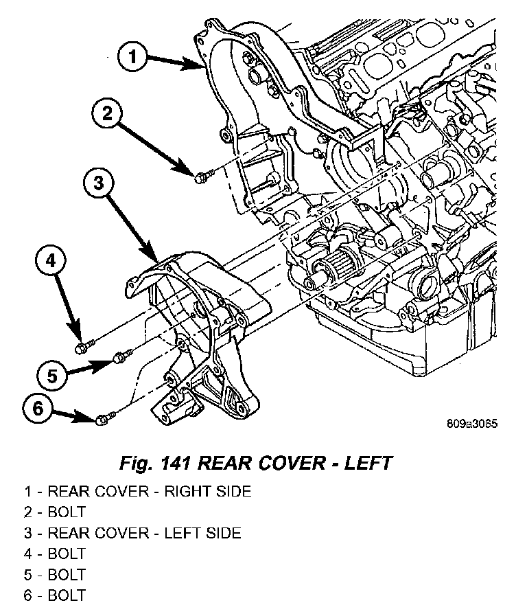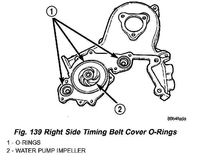 NOTE: The right side rear timing belt cover has O-rings to seal the water pump passages to cylinder block (Fig. 139). Do not reuse the O-rings.