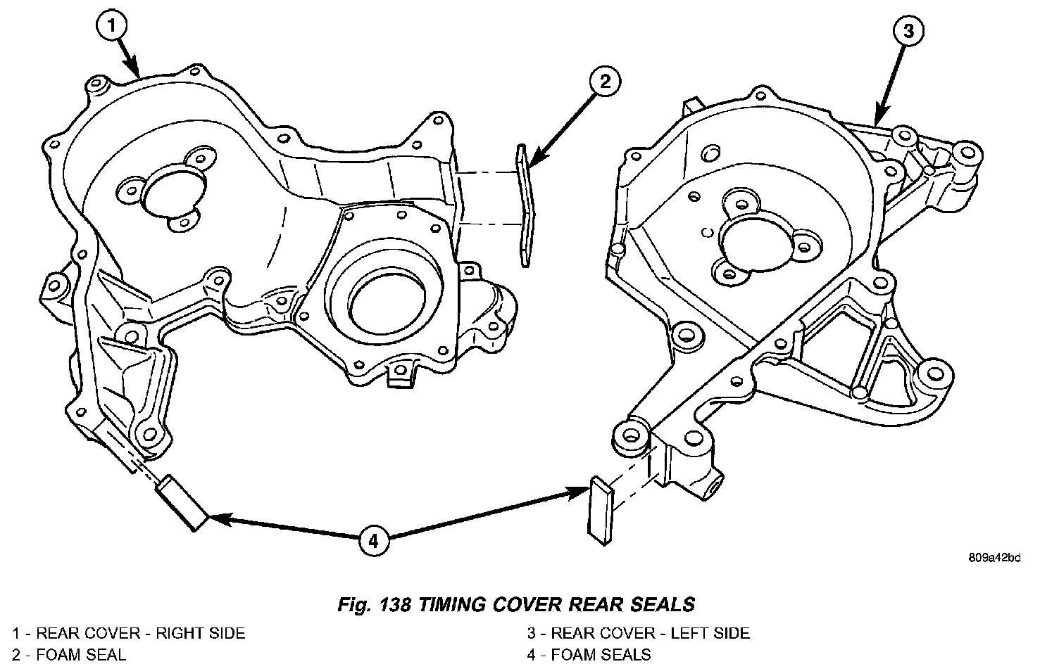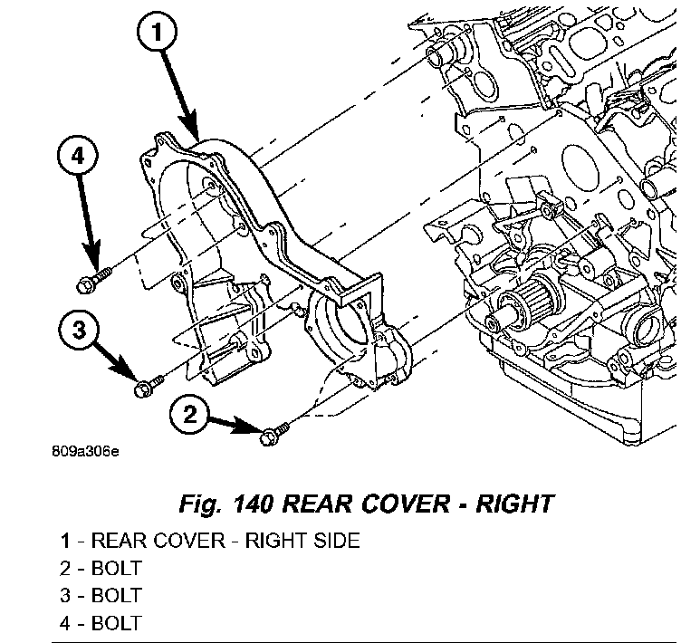 2. Clean right rear timing belt cover O-ring sealing surfaces and grooves (Fig. 139). Lubricate new O-rings with Mopar Dielectric Grease or equivalent to facilitate assembly.