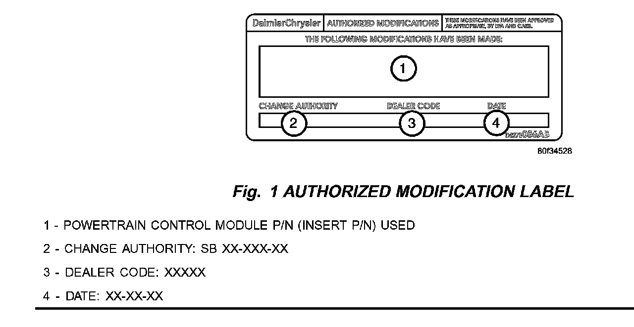22. Type the necessary information on the "Authorized Modification Label" p/n 04275086AB and attach near the VECI label (Fig. 1).