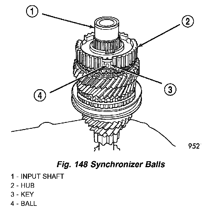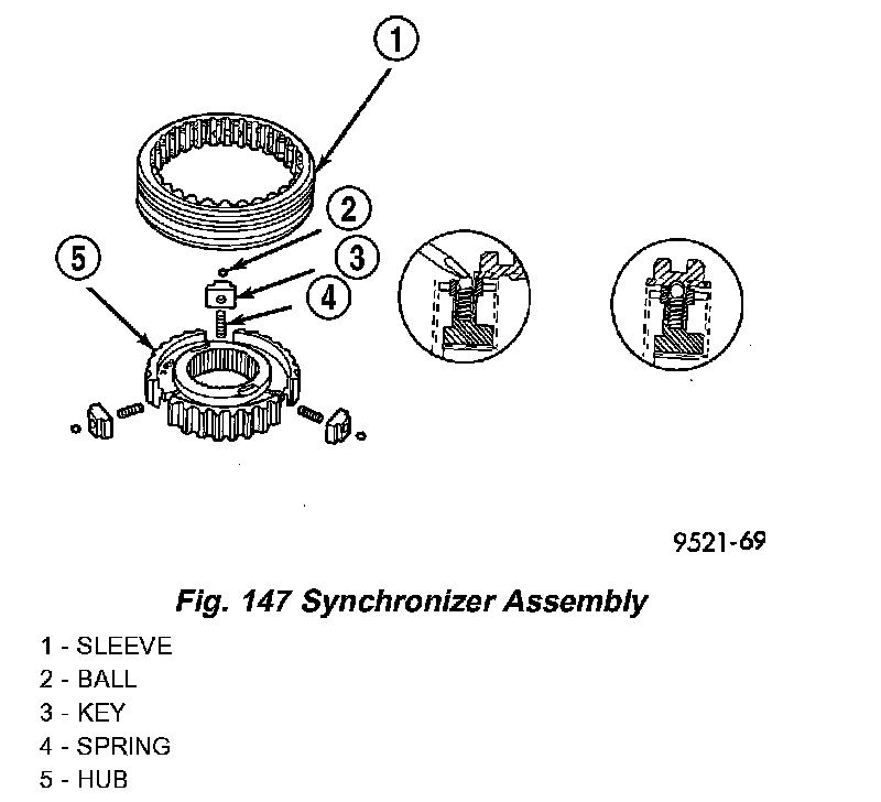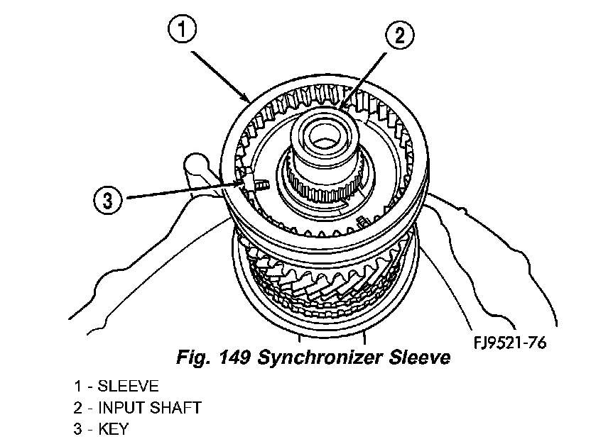 Place synchronizer in a clean shop towel and wrap. Press on inner hub. Carefully open up shop towel and remove springs, balls, keys, hub, and sleeve.