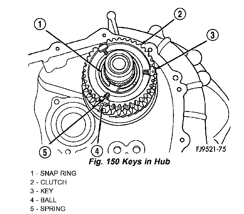 6. Line up stop ring tang over the keys in the hub (Fig. 150). Install stop rings. Center the keys and balls by pushing on both stop rings.