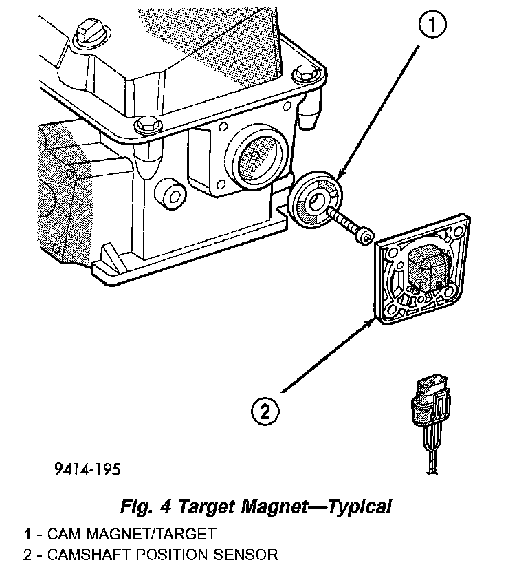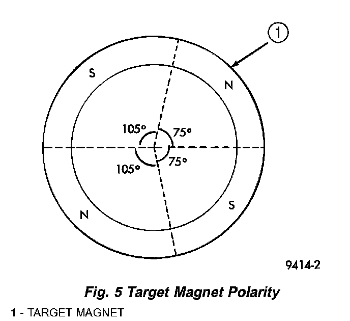A target magnet attaches to the rear of the camshaft and indexes to the correct position. The target magnet has four different poles arranged in an asymmetrical pattern . As the target magnet rotates, the camshaft position sensor senses the change in polarity. The sensor output switch switches from high (5.0 volts) to low (0.5 volts) as the target magnet rotates. When the north pole of the target magnet passes under the sensor, the output switches high. The sensor output switches low when the south pole of the target magnet passes underneath.