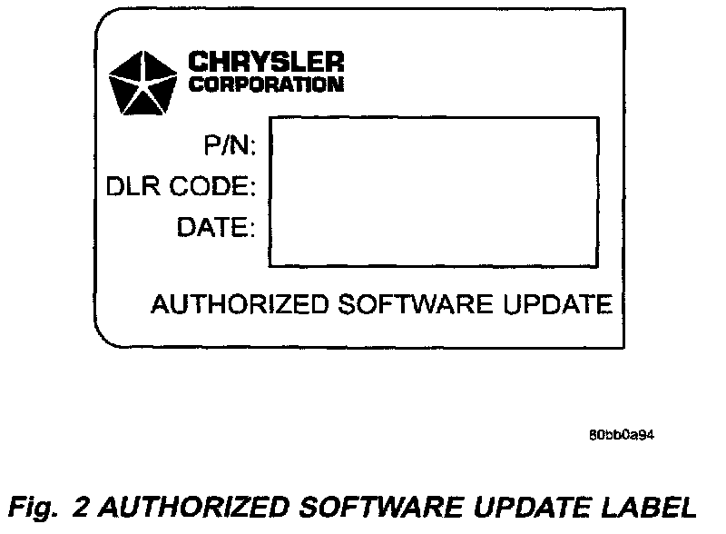 3. Type the necessary information on the "Authorized Software Update Label" p/n 04669020 (Fig. 1). Attach the label to the PCM and/or TCM as necessary and cover the label(s) with the clear plastic overlay.