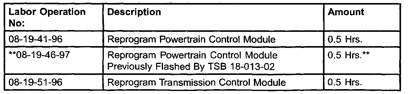 **IF THE TCM AND PCM WERE PREVIOUSLY FLASHED AS DIRECTED BY TECHNICAL SERVICE BULLETIN 18-013-02, ONLY THE PCM CAN BE REFLASHED AS DIRECTED BY THIS SERVICE BULLETIN (18-013-02 REV. A)**.