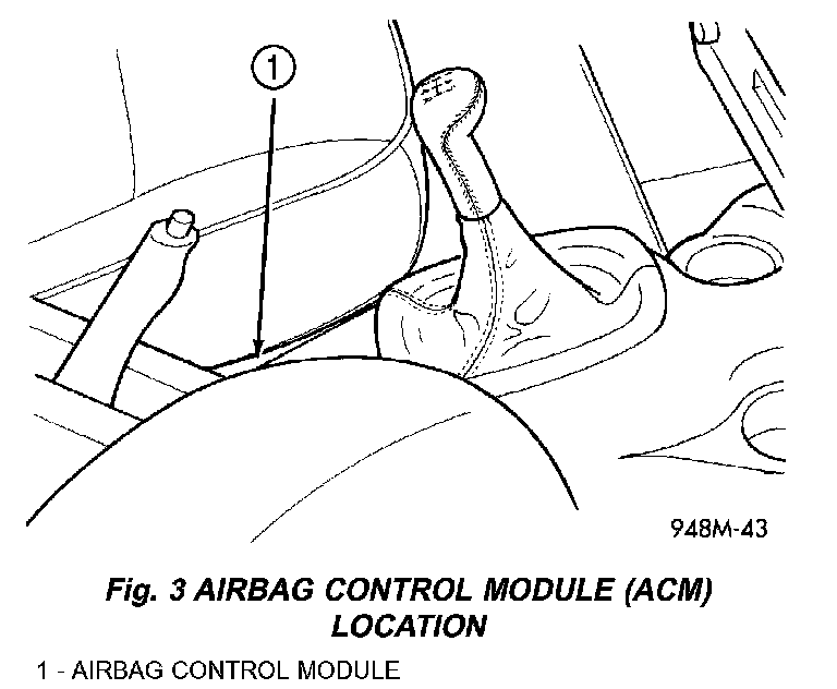 The Airbag Control Module (ACM) contains the sensing element, safing sensor, and energy reserve capacitor. The module is mounted on the tunnel/floor pan between the gear shift lever and the park brake lever.