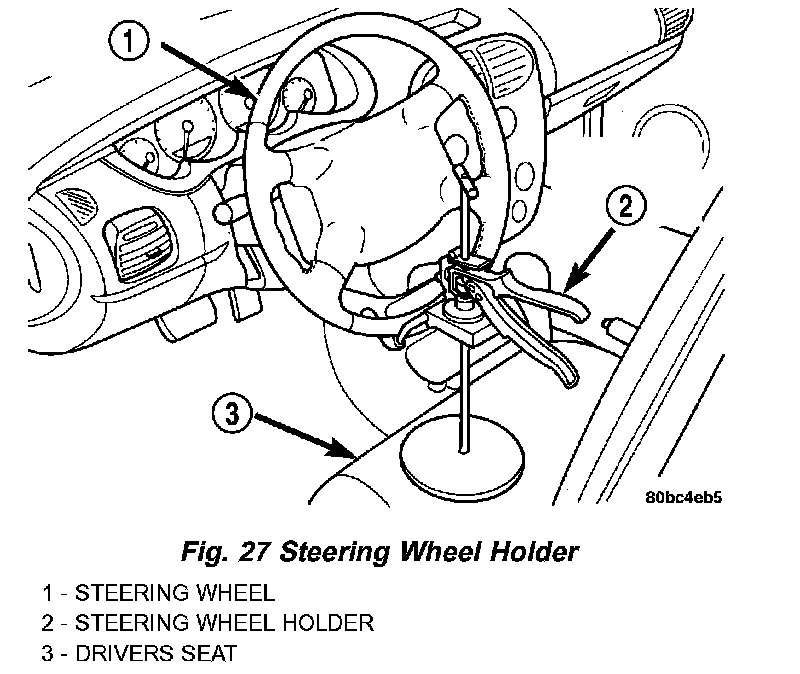 1. Place the steering wheel in the STRAIGHT AHEAD position. Using a steering wheel holder, lock the steering wheel in place to keep it from rotating. This keeps the clock spring in the proper orientation.