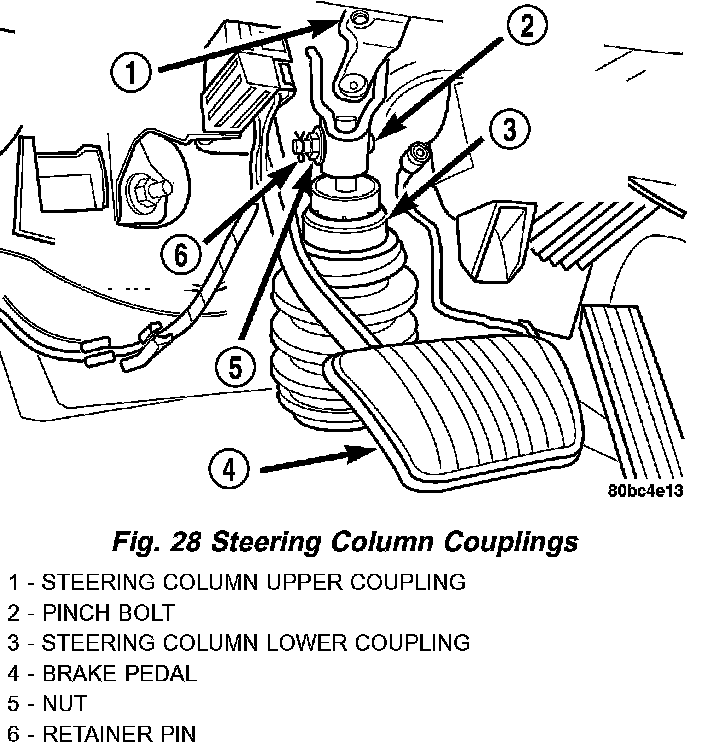 2. Inside the passenger compartment, remove the steering column coupling retainer pin, back off the pinch bolt nut, and remove the steering column coupling pinch bolt (the pinch bolt nut is caged to the coupling and is not removable). Separate the upper and lower steering column couplings.