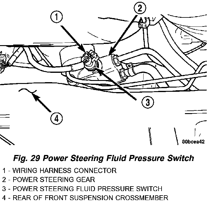 10. Reconnect the wiring harness connector to the power steering fluid pressure switch. Be sure the locking tab on the wiring harness connector is securely latched.