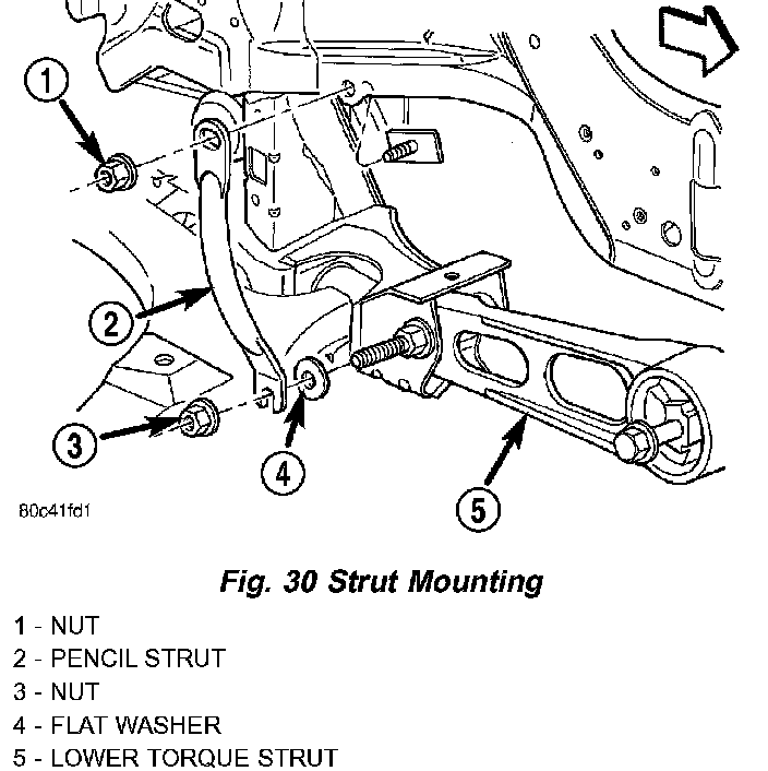 6. Remove the pencil strut from the right front corner of the crossmember and body of the vehicle. Remove the washer behind the strut from the torque strut bolt.