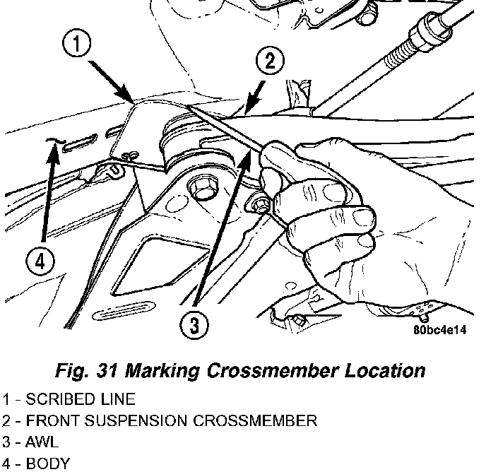 8. Using an awl, scribe a line marking the location of where the front suspension crossmember is mounted against the body of the vehicle.