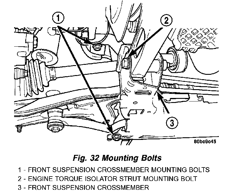 NOTE: When reinstalling the front suspension crossmember back in the vehicle, it is very important that the crossmember be attached to the body in exactly the same spot as when it was removed. Otherwise, the vehicle's wheel alignment settings (caster and camber) will be lost.