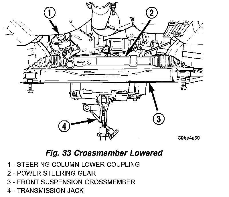 12. Lower the front suspension crossmember using the transmission jack enough to allow sufficient access to the steering column lower coupling. When lowering front suspension crossmember, do not let crossmember hang from lower control arms or power steering hoses. The weight should be supported by the transmission jack.
