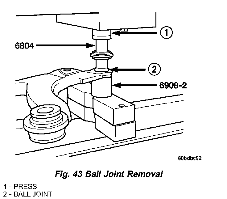 2. Position the Receiver, Special Tool 6908-2, on a hydraulic press to support the lower control arm (Fig. 43). Place the control arm on top of Tool 6908-2 so that the bottom of the ball joint sets into the Receiver cup.