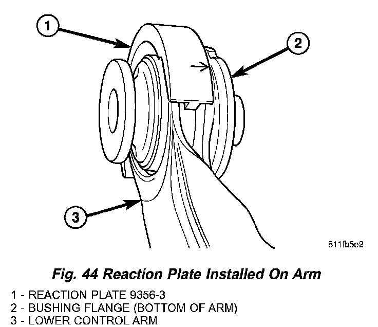 3. Install the Reaction Plate, Special Tool 9356-3, over the end of the control arm so that the arrows on the Reaction Plate point toward the bushing flange on the bottom of the arm as shown (Fig. 44).