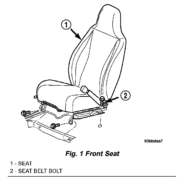 4. Remove bolts attaching front of seat track to floor crossmember (Fig. 1).