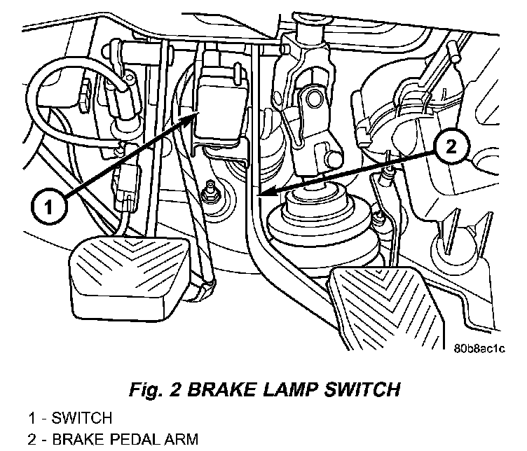 The brake lamp switch is located under the instrument panel, at the brake pedal arm (Fig 2). It has three internal switches controlling various functions of the vehicle. It's main function is to control operation of the vehicle's brake lamps. Other functions include speed control deactivation, brake sense for the antilock brake system and brake sense for the brake transmission shift interlock.