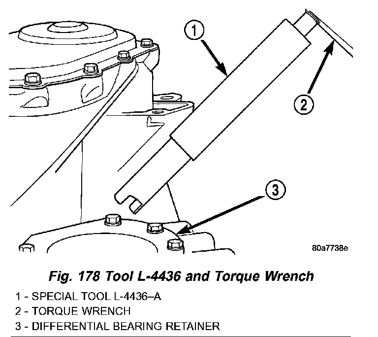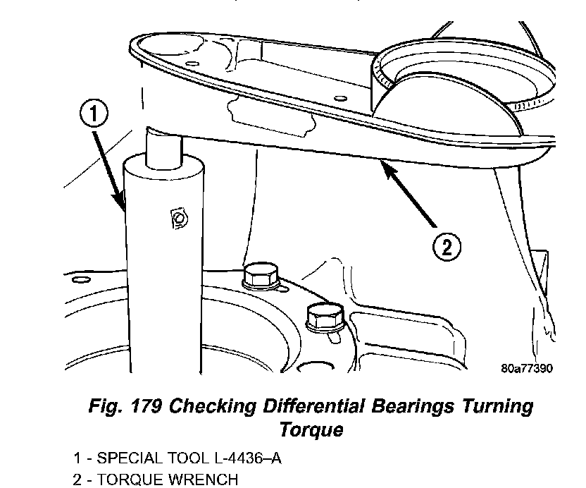 4. Using Tool L-4436A and an inch-pound torque wrench, check the turning torque of the differential (Fig. 179). The turning torque should be between 5 and 18 inch-pounds.