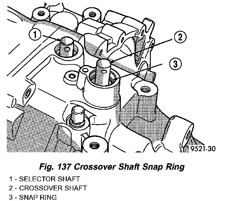 3. Using snap-ring pliers, remove the snap ring at the crossover shaft bore (Fig. 137).