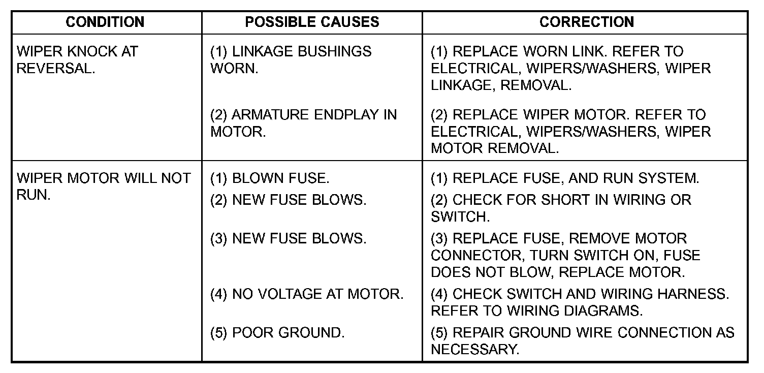 Whenever a wiper motor malfunction occurs, verify that the wire harness is properly connected, then start normal diagnosis and repair procedures. Refer to the WIPER MOTOR DIAGNOSIS table.