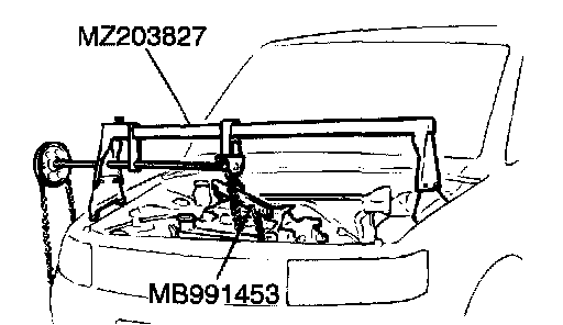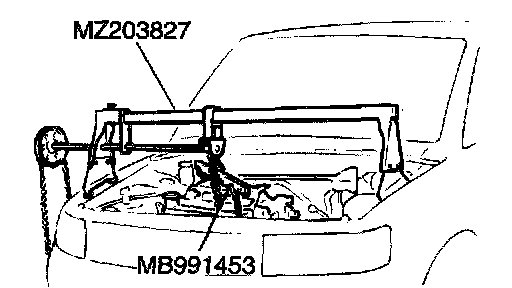 3. Remove the chain block and support the engine assembly with special tools MB991453 and MZ203827.