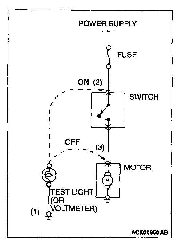 3. Then, connect the test light or voltmeter to the motor connector. The test light should not come on, or the voltmeter should indicate no voltage. When the switch is turned ON in this state, the test light should come on, or the voltmeter should indicate a voltage, with the motor starting to run.