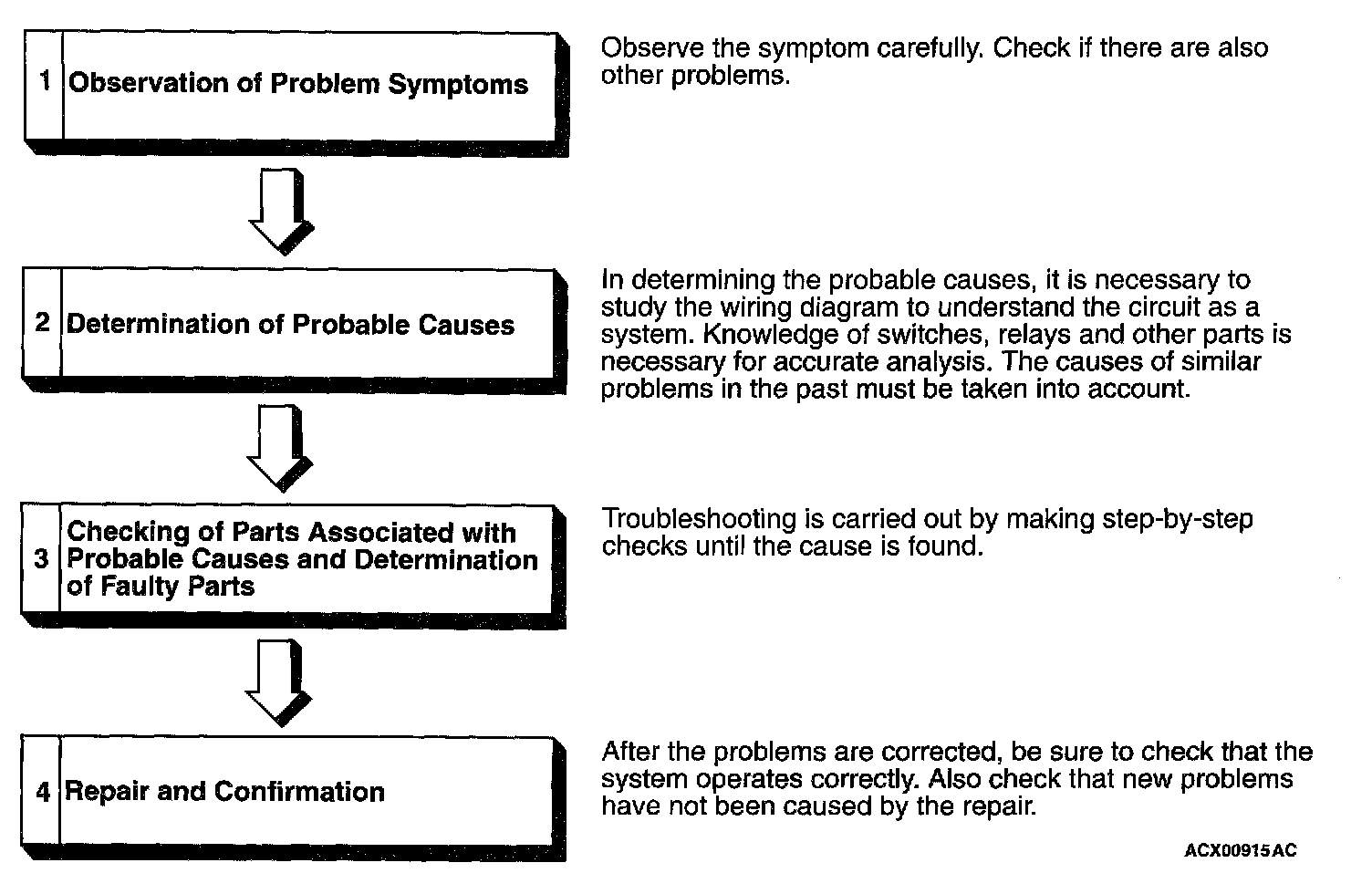 If an attempt is made to solve a problem without going through correct steps for troubleshooting, the symptoms could become more complicated, resulting in failure to determine the causes correctly and making incorrect repairs. The four steps should be followed in troubleshooting.