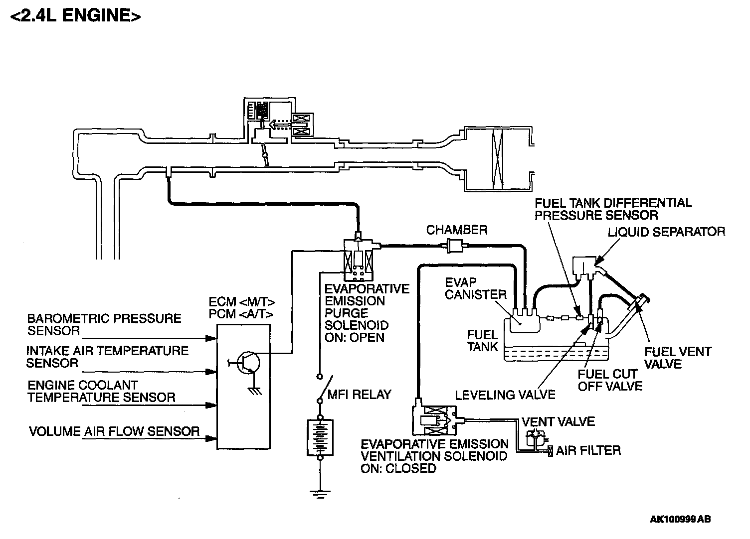 An EVAP ventilation solenoid is provided between the EVAP canister and atmosphere to monitor for OBD-II EVAP leaks. This solenoid is normally OFF. However, it turns ON when monitoring the OBD-II EVAP leaks and shuts off the atmosphere flow to the EVAP canister. Then the fuel tank differential pressure sensor monitors the fuel vapor pressure to detect OBD-II EVAP leaks. The fuel vent valve and the leveling valve prevent fuel from being overfilled. The fuel vent valve and the leveling valve prevents fuel leaks just if the vehicle is rolled over in an accident.