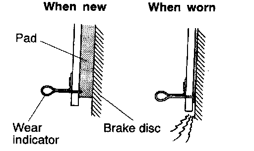 DISC BRAKE PAD CHECK AND REPLACEMENTNOTE: The brake pads have indicators that contact the brake disc when the brake pad thickness becomes 2 mm (0.08 inch), and emit a squealing sound to warn the driver.