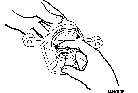 4. Be careful that the piston boot does not become caught, when lowering the caliper assembly and installing the guide pin.