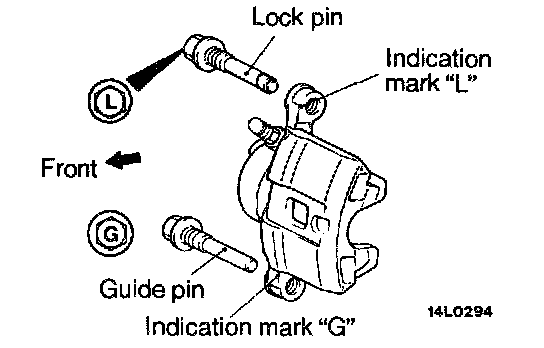 Install the guide pin as illustrated that each head mark of the guide pin and the lock pin matches the indication mark ("G" or "L") located on the caliper body.