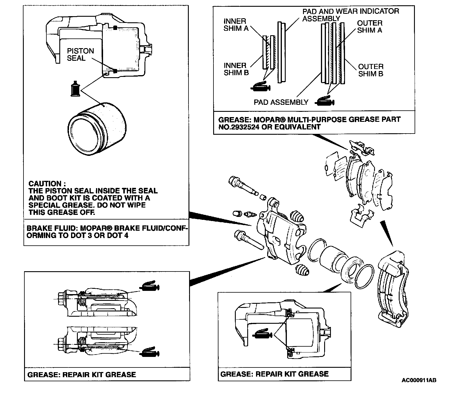 2. Clean the piston surface and inner cylinder with alcohol brake fluid MOPAR Brake Fluid/Conforming to DOT 3 or DOT 4.