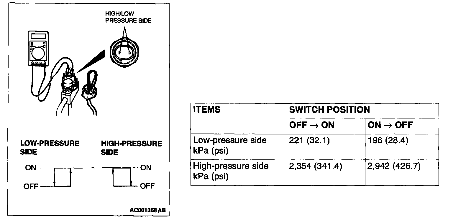 3. When the high/low pressure sides of the dual pressure switch are at operation pressure (ON) and there is continuity between the respective terminals, then the condition is normal. If there is no continuity, replace the switch.
