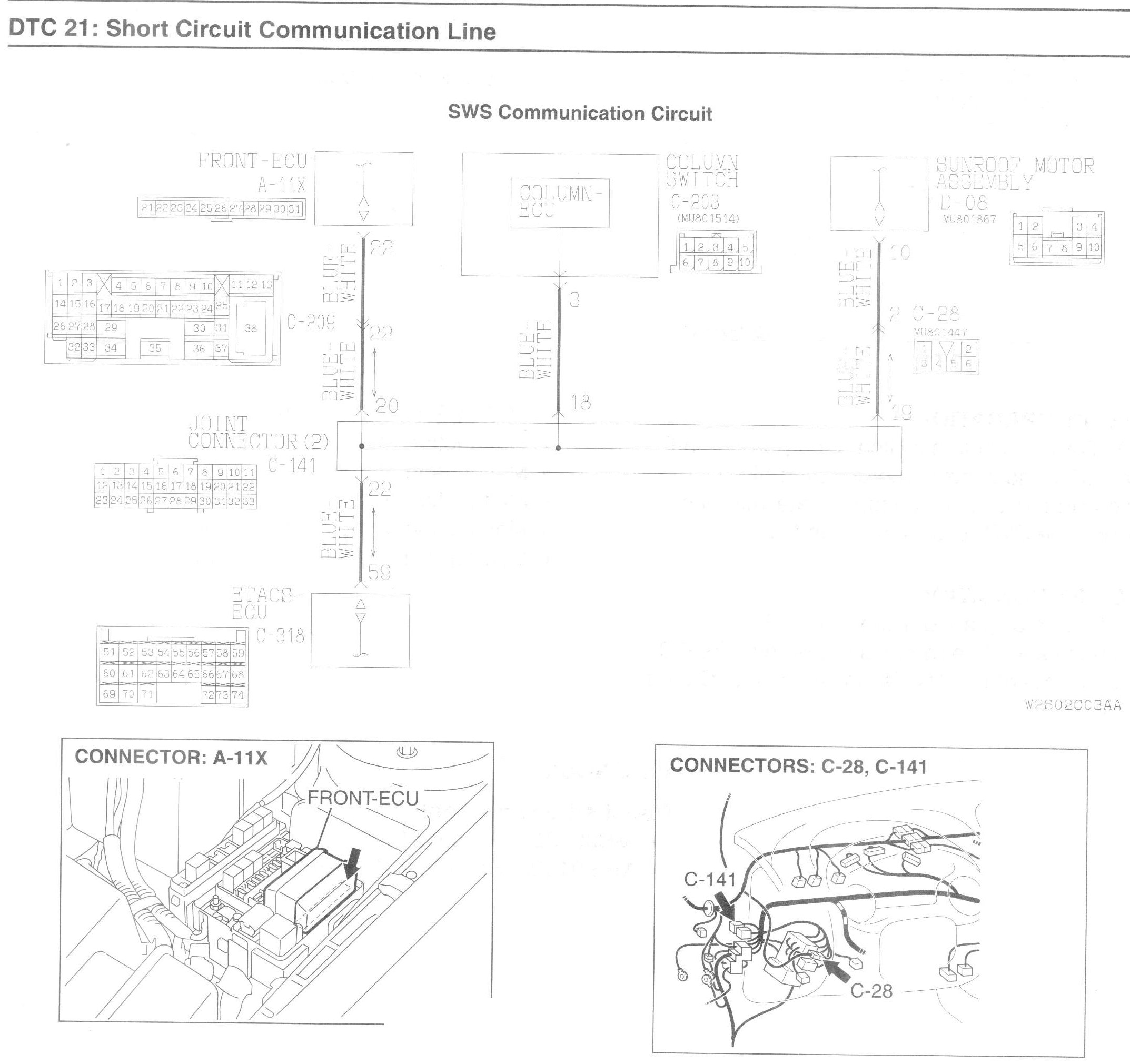 ETACS-ECU, column switch (incorporated in ECU), front-ECU and sunroof motor assembly (incorporated in ECU) communicate with each other through the SWS communication line.