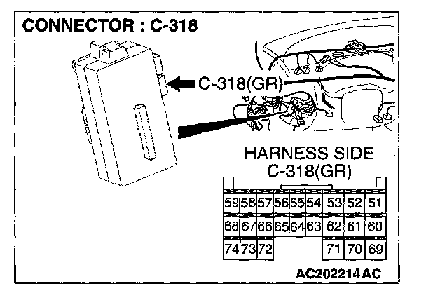 STEP 2. Check the wiring harness from ETACS-ECU connector C-318 (terminal 59) to column switch connector C-203 (terminal 3), front-ECU