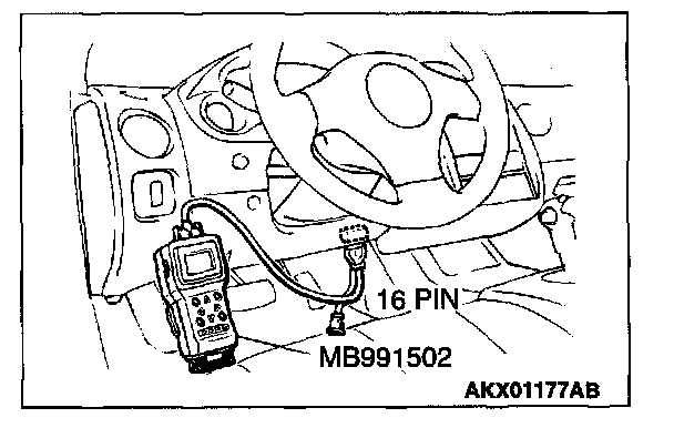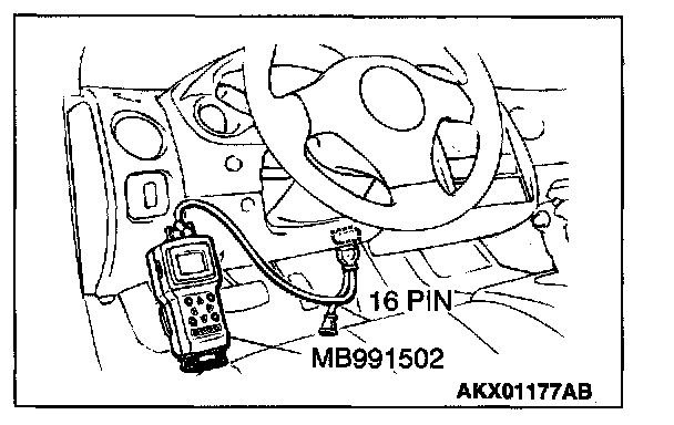 CAUTION: To prevent damage to scan tool MB991502, always turn the ignition switch to the "LOCK" (OFF) position before connecting or disconnecting scan tool MB991502.